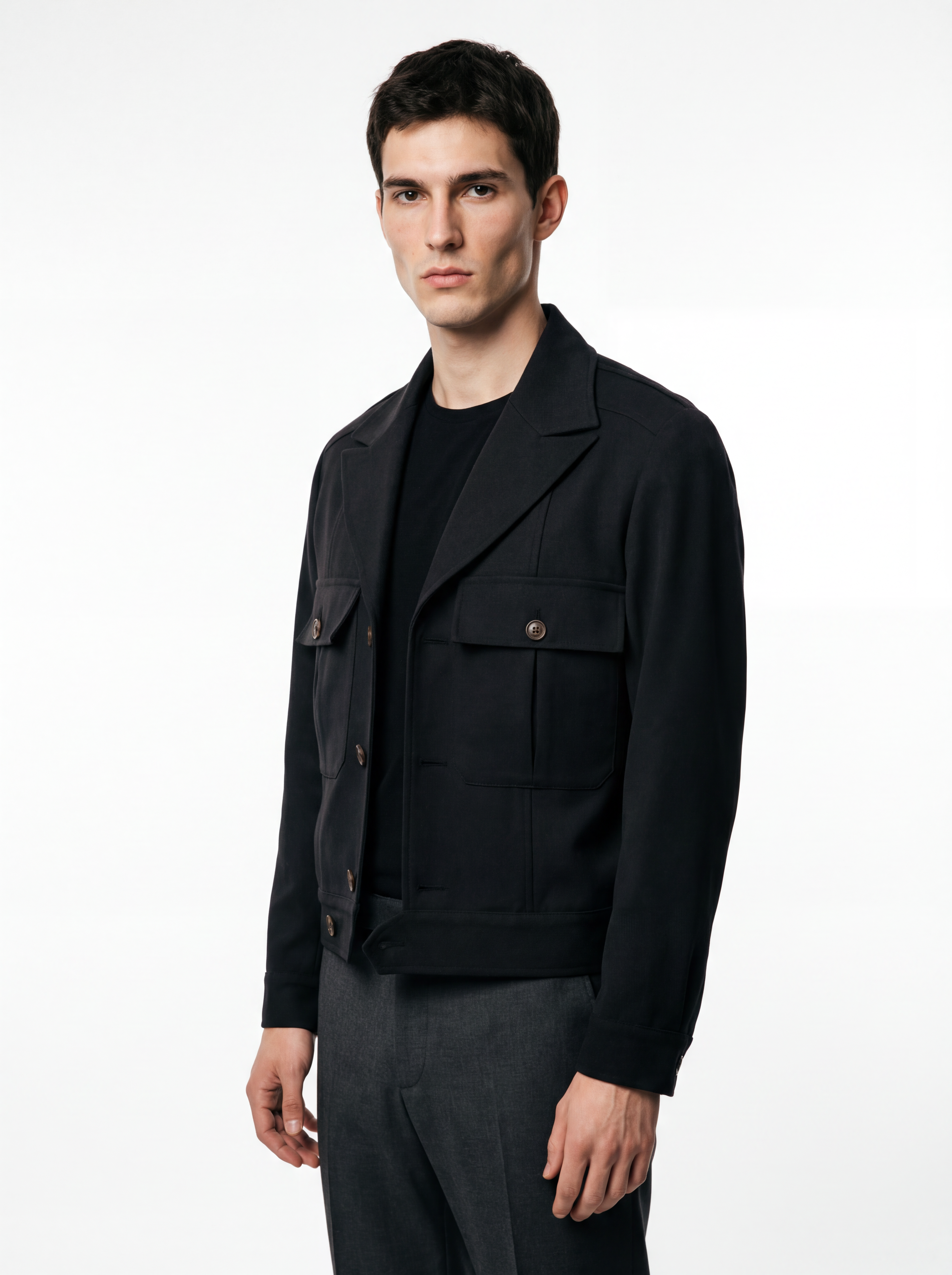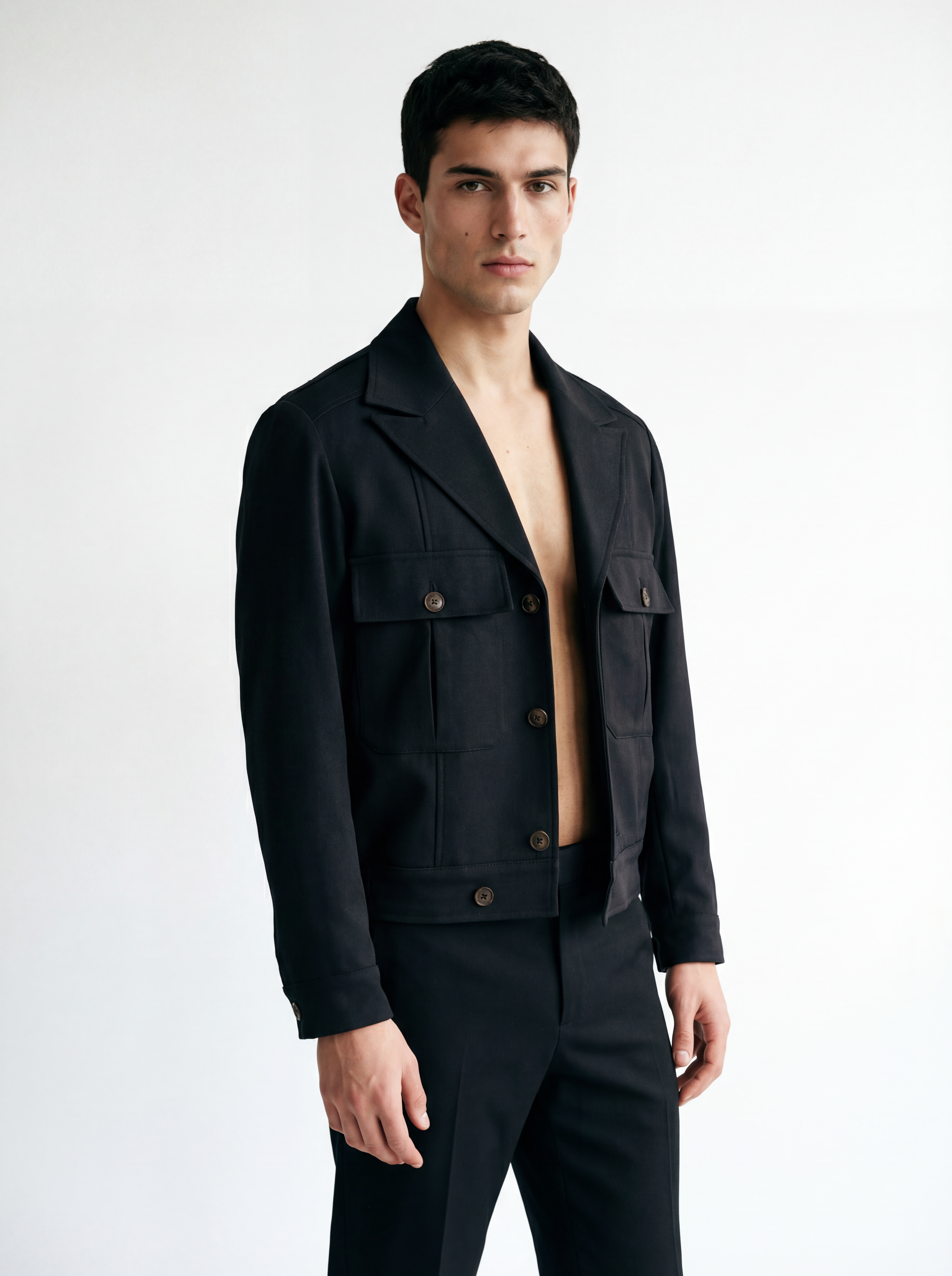 Descrizione prodottoGiacca crop dal carattere deciso, definita da una linea pulita e da dettagli strutturati. Le tasc...