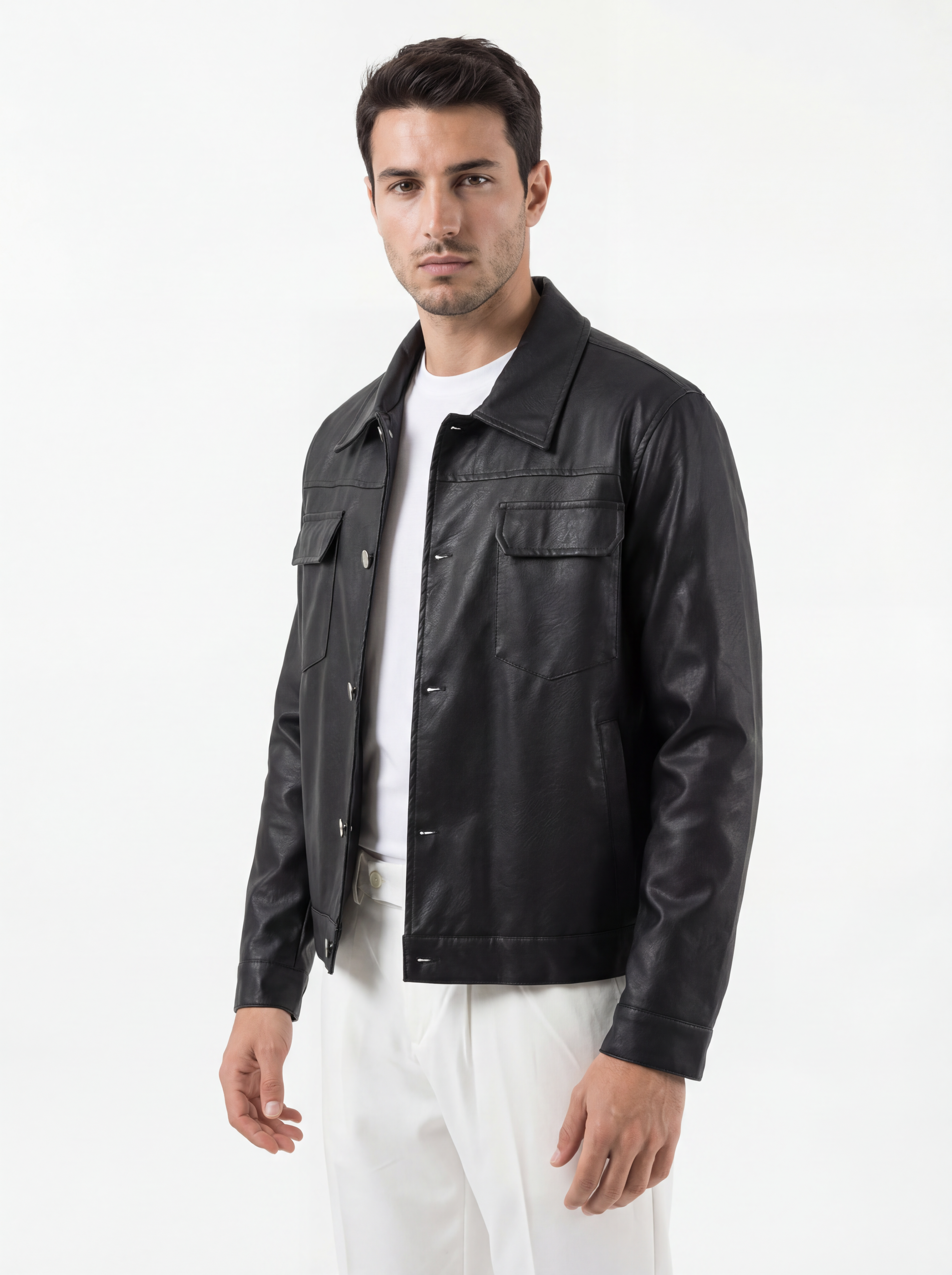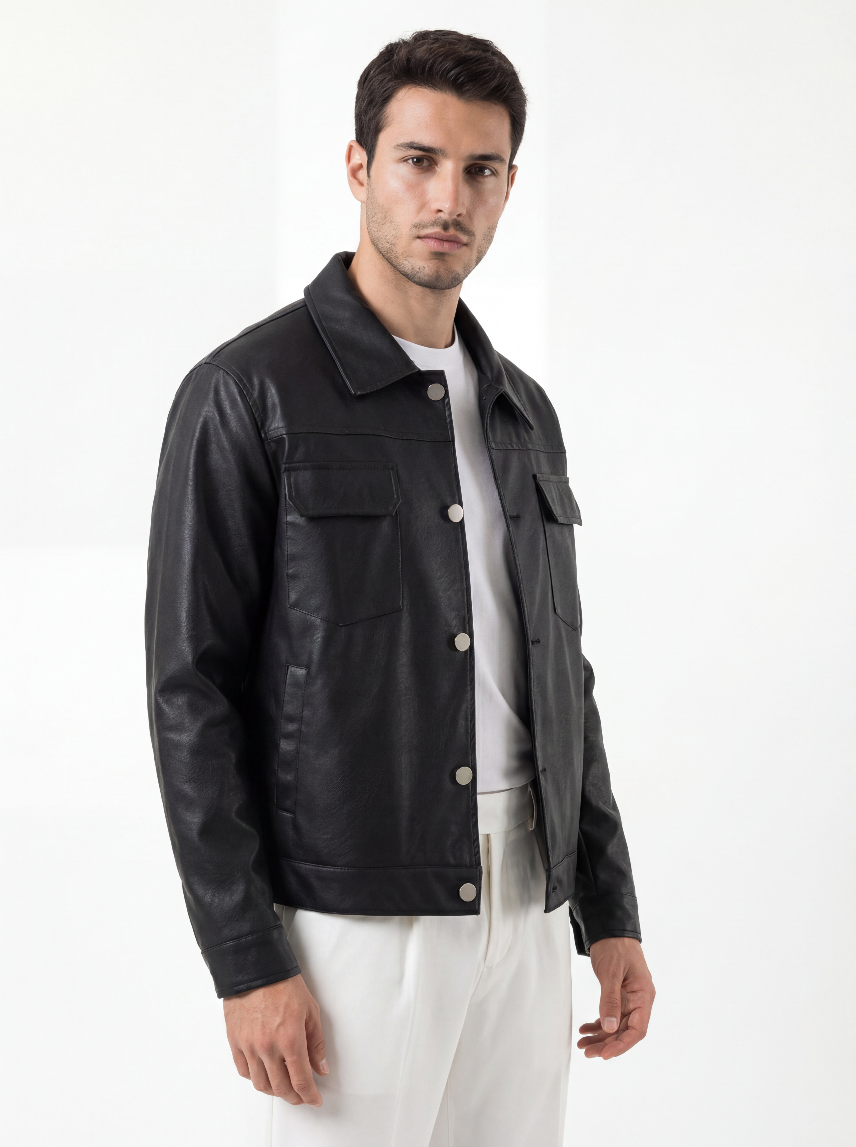 Jacket cropped eco nera dal carattere deciso e contemporaneo. Il taglio corto valorizza la silhouette, mentre le line...